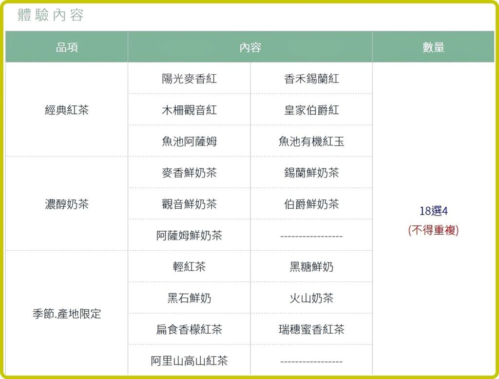 ▼本次體驗的品項表(含經典紅茶、濃醇奶茶、季節產定限定三大類):